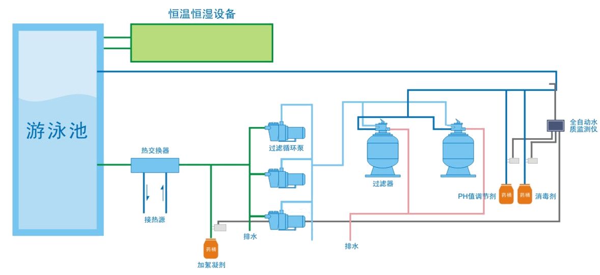 游泳池水質處理系統(tǒng)遵從動態(tài)平衡工作原理,在循環(huán)處理過程中達到水質的徹底凈化。