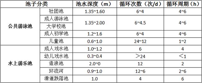 游泳池由于用途不同而循環(huán)周期也會(huì)不相同;水上游樂(lè)池也是因?yàn)槠溆猛镜牟煌h(huán)周期也不同。除了用途,也包括泳池的水深、泳池負(fù)荷等因素確定循環(huán)周期。或如下表:
