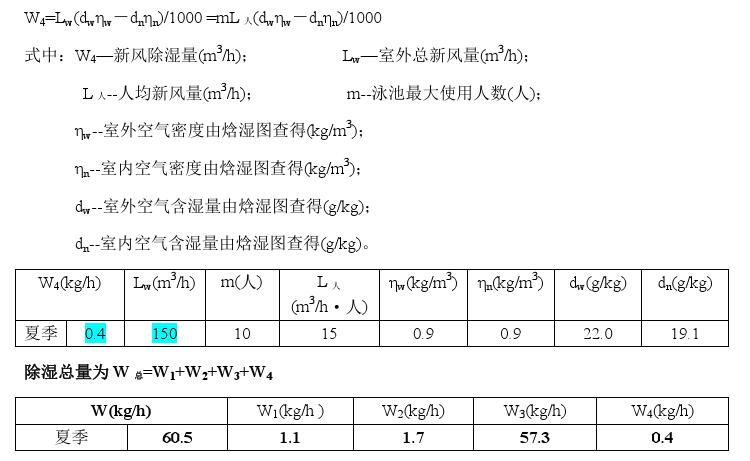 根據設計要求進行計算,計算會設計除濕量計算,泳池恒溫負荷計算,除濕加熱負荷計算,夏季空調負荷計算,冬季供暖負荷計算這幾個方面,其中夏季室外空氣濕度大,環境溫度高,大氣壓較低,水分更容易蒸發,除濕量一般在夏季達到最大值,所以除濕負荷計算以夏季計算給過為選型指標;冬季自來水溫度低,池水散熱量大,泳池恒溫負荷和初次加熱負荷會在冬季達最大值,所以泳池恒溫負荷計算和初次加熱負荷計算以冬季計算結果為為選型指標。