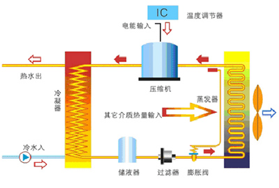 泳池?zé)岜脵C組系統(tǒng)工作過程:處于低壓液態(tài)循環(huán)工質(zhì)(如氟利昂R22、404a)流經(jīng)泳池?zé)岜脵C組的蒸發(fā)器時蒸發(fā),此時從低溫?zé)嵩刺幬諢崃,變成蒸氣后,流進(jìn)壓縮機,經(jīng)過壓縮機壓縮后升溫升壓,變成高溫、高壓蒸氣,排出壓縮機,蒸汽流經(jīng)泳池?zé)岜脵C組冷凝器,在冷凝器中,將從蒸發(fā)器中吸取的熱量和壓縮機耗功所相當(dāng)?shù)哪遣糠譄崃颗懦觯瑐鬟f給流經(jīng)泳池?zé)岜脵C組的鈦管中的冷水,使其溫度提高。循環(huán)工質(zhì)蒸汽冷凝降溫后變成液相,高壓液體流經(jīng)膨脹閥后,壓力下降,變成低壓液體,低壓液相工質(zhì)流入蒸發(fā)器,由于沸點低,因而很容易從周圍環(huán)境吸收熱量而再蒸發(fā),又形成低溫低壓蒸汽,依此不斷地進(jìn)行重復(fù)循環(huán)。就能使低溫?zé)崃窟B續(xù)不斷地傳遞到高溫?zé)嵩矗ㄋ┨,以滿足泳池水加熱恒溫需求。