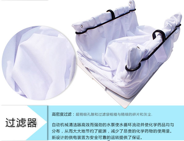 3、同時過濾袋指示燈讓我們知道何時要傾倒袋中的雜物。工作周期短,高級程序設計使人們僅需6小 時就可以清潔泳池一次。
